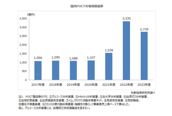 2021年度から2022年度にかけイムノクロマト法の新型コロナウイルス迅速抗原検査キットの市場が急速に拡大した。とくに2022年度においては自治体等にて同迅速抗原検査キットを大量に確保する動きが鮮明となった。2023年5月に新型コロナウイルスの感染症法上の位置づけが5類に移行してからは、医療機関以外での新型コロナウイルス検査需要が減少し、各方面での同検査製品特需の反動を受け、2023年度のPOCT市場規模は縮小に向かう形となった。
