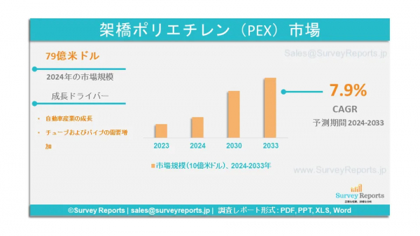 Surveyreportsの専門家は、クロスリンクポリエチレン(PEX)市場の調査分析を行い、2024年のクロスリンクポリエチレン(PEX)市場規模は79億米ドルに達すると予測した。さらに、架橋ポリエチレン(PEX)市場のシェアは、2033年末までに139億米ドルの収益に達すると予測されている。架橋ポリエチレン(PEX)市場は、2024年から2033年の予測期間にわたって、年間平均成長率(CAGR)約7.2%で成長すると予測されている。
