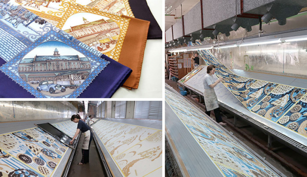 横浜スカーフは 一つ一つ様々な”職人の手”によって、手間をかけることを惜しまず丁寧な作業を重ねることで生み出されます。スカーフの製造工程の中で、「図案」・「型」・「染め」・「巻き(縫製)」などの各工程の一つ一つの技術精度がとても高く、この技術水準はフランス・イタリアの水準と同列であり、特に絹の薄地へのプリント技術は世界一と言われています。