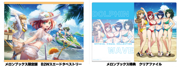 「ドルフィンウェーブ オフィシャルビジュアルコレクション」をメロンブックスで購入すると、表紙イラストを使用したクリアファイルが購入特典として付属いたします。また、クリアファイルとは別のイラストを使用した「B2Wスエードタペストリー付きメロンブックス限定版」も発売いたします!