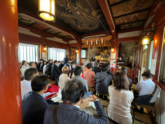 午前11時からは辯天堂本堂において、寄せられたメガネを前に『めがね供養会』(読経)が開式。一般の方はじめ組合関係者あわせて約40名の参列者が集うなか、東叡山寛永寺 不忍池辯天堂・ご導師様よる読経。そして一人一人が、回ってくる香炉を抱え焼香いたしました。式は粛々と執り行われ、午前11時40分に閉式となりました