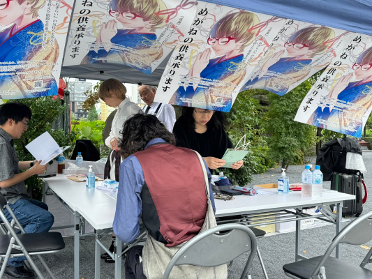 ご来場者には、イラスト入りの当組合特製『オリジナルめがね拭き』、10月12日~13日開催の(公社)東京都眼科医会主催『第12回 Tokyo Eye Festival 2024』チラシ、国家検定資格・眼鏡作製技能士の『かけごこち。リーフレット』などを配付いたしました。またポスターモデルを務めていただいたアーティストで“めがね大使”のCUTIEPAI まゆちゃんが、ご来場。受付担当から参列まで、ご一緒いただきました。