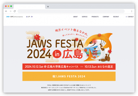 株式会社エーピーコミュニケーションズは、2024年10月12日に広島で開催される「JAWS FESTA 2024 in Hiroshima」に企業スポンサーとして協賛致します。これに合わせて、イベント応援サイトを公開いたしました。