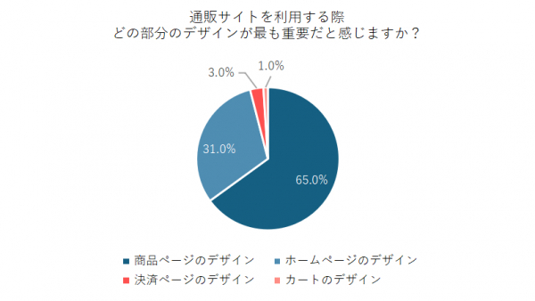 「商品ページのデザイン」65%、「ホームページのデザイン」31%、「決済ページのデザイン」3%、「カートのデザイン」1%という結果に。通販サイトにおいて、多くのユーザーが商品ページのデザインを重要視していることが明らかになりました。