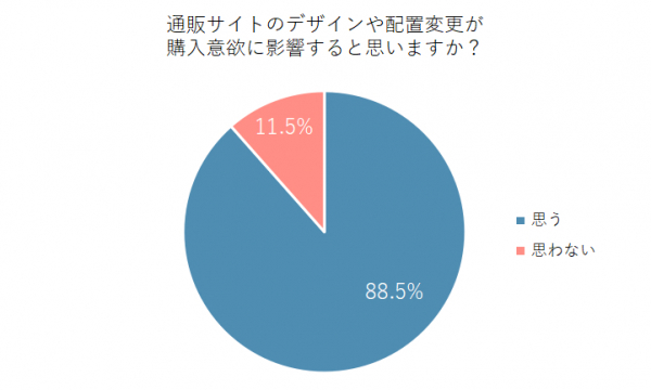 通販サイトのデザインや配置変更が購買意欲に影響するかどうかたずねたところ、「思う」と回答した人は全体の88.5%にのぼりました。視覚的な情報がユーザーの購買意欲に影響を与えていることがわかりました。