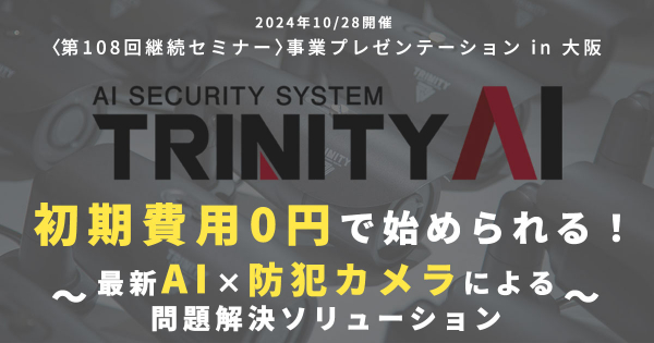 防犯カメラ・AIカメラの専門店 株式会社トリニティー(本社:愛知県名古屋市)代表取締役 兼松拓也は、10/28(月)関西大学梅田キャンパスで開催される『〈第108回継続セミナー〉事業プレゼンテーション in 大阪』に、講師メンバーとして登壇いたします。