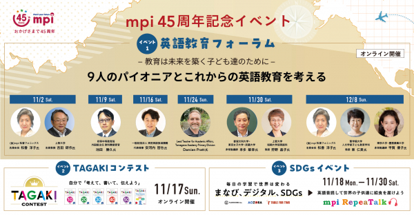 mpiはお陰様で45周年を迎えました。それを記念し、これまでとは趣を変え、英語教育フォーラム(オンライン)「9人のパイオニアとこれからの英語教育を考える」、「第1回TAGAKIコンテスト」、SDGsイベント「英語音読して世界の子どもたちに給食を届けよう」の3つのイベントを同時期に開催いたします。今回は、指導者や保護者だけでなく、子どもたちも参加できるSDGsイベントも実施いたします。この3つのイベントが、大人たちにとっては日本の英語教育について学ぶ、子どもたちにとっては世界の課題を知る機会となり、それぞれの立場で教育を通し未来に貢献するために何が必要なのかを考えるきっかけになることを期待しています。