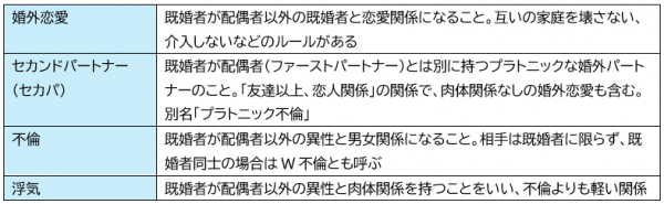 ・ セカンドパートナーは現在、既婚者以外の独身カップルにも広がっている様子ですが、今回の調査は本来の意味に則して対象を既婚者に限定しました。