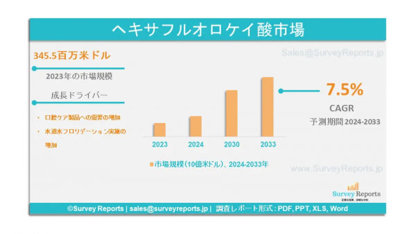 Survey Reports LLCは、2024年10月、ヘキサフルオロケイ酸市場のセグメント化に関する調査レポートを発行したと発表した。グレード別(40%、35%、その他)、用途別(化学中間体、金属表面処理、水道水フッ素処理、木材保存、 ガラス添加剤、セラミック硬化剤、その他)別、販売チャネル別(直接チャネル、流通チャネル、その他) - 2024年から2033年までの世界市場分析、動向、機会、予測を提供する。これは、ヘキサフルオロケイ酸市場の成長ドライバー、市場機会、課題、脅威など、いくつかの重要な市場力学に焦点を当てている。