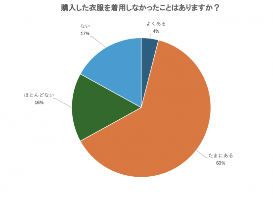 「購入した衣服を着用しなかったことはありますか?」のアンケートについて、「よくある」が4%「たまにある」が63%「ほとんどない」が16%と、83%の人が過去に一度は衣服の購入で失敗した経験があることが分かりました。