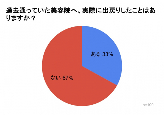 また、「過去通っていた美容院へ、実際に出戻りしたことはありますか?」の質問では、『ある』が33%、『ない』が67%という結果となり、3人に1人が出戻り経験があることがわかりました。