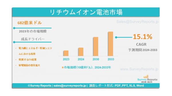 Survey Reports LLCは、2024年10月、リチウムイオン電池市場の製品別(コバルト酸リチウム、リン酸鉄リチウム、ニッケルコバルトアルミニウム酸リチウム、マンガン酸リチウム、チタン酸リチウム、 ニッケル・マンガン・コバルト)別、用途別(自動車、家電製品、産業用、エネルギー貯蔵システム、医療機器など) - 2024年から2033年までの世界市場分析、動向、機会、予測を提供する。リチウムイオン電池市場の成長要因、市場機会、課題、脅威など、いくつかの重要な市場力学に焦点を当てている。