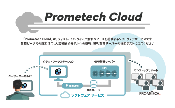 「Prometech Cloud」は、シミュレーション計算条件の設定や計算結果をマウスで操作する「GUIワークステーション」と、CAEの数値計算を高速に実行する「CAE計算サーバー」の双方をクラウドで提供するサービスです。近年急激に単価が上昇しているGPUや大規模な計算システムを設備導入することなく、お手持ちのPCブラウザですぐにご利用を開始いただけます。業務繁忙期における短期間での集中利用、次世代の計算機導入を見込んだ大規模な解析、同時複数計算による短期間でのパラメータスタディが可能となるため、これまでのCAE業務のリードタイムを大幅に短縮できます。
