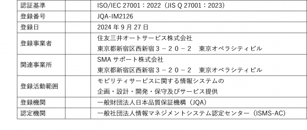 SMAS(住友三井オートサービス株式会社、本社:東京都新宿区 社長:佐藤 計)は、モビリティサービスに関する情報システムの企画・設計・開発・保守及びサービス提供において、情報セキュリティマネジメントシステム(ISMS)の国際規格である「ISO/IEC 27001:2022(JIS Q 27001:2023)」の認証を以下の通り取得しましたのでお知らせします。