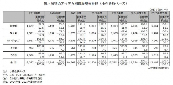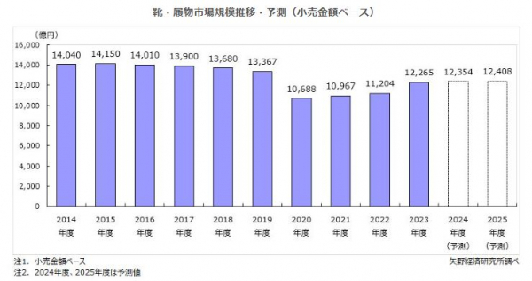 2024年度の国内靴・履物小売市場規模を前年度比100.7%の1兆2,354億円と予測する。