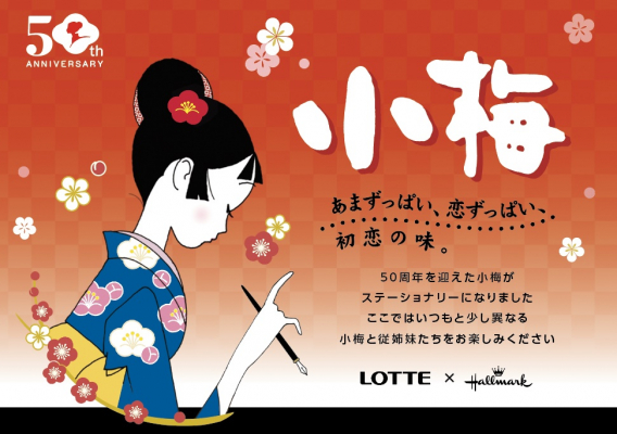 今回の企画にあたり、LOTTE小梅だよりサイト内にある「初恋すとおりい」の世界観に沿って、“初恋”や“手紙”をキーワードにしました。小指に赤い糸を絡めている小梅ちゃんやペンを持っている小梅ちゃんなど、ホールマークオリジナルでアートの一部を描き起こしました。