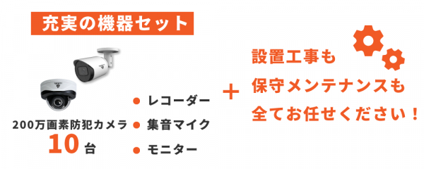 防犯カメラ(200万画素)10台/マイク1台/レコーダー/モニター1台/レンタル期間中の不具合は全期間無償保証/初期導入費0円
