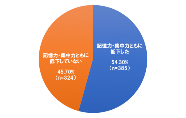 0歳以上の子を持つ女性709名のうち、直近1ヶ月で記憶力・集中力がともに低下したのは54.30%(385名)、記憶力・集中力がともに低下していないのは45.70%(324名)であった(図1)。