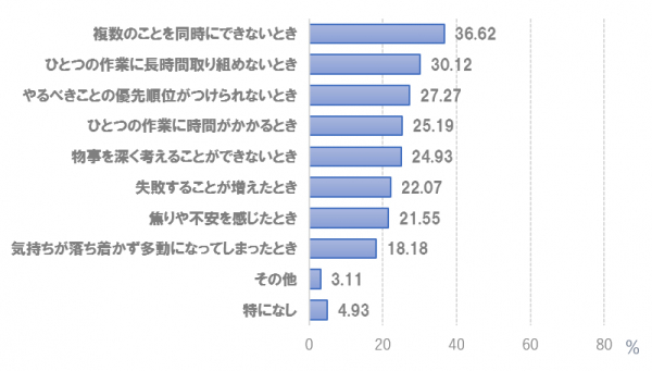 記憶力・集中力ともに低下したと感じているママ達は、「忘れ物が増えたとき」「今していた行動を忘れたとき」などに記憶力が低下したと感じ、「複数のことを同時にできないとき」「物事を深く考えることができないとき」などに集中力の低下を感じることが分かった(図2、図3)。