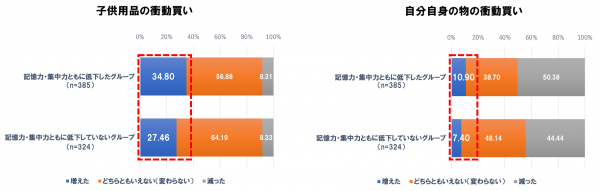 記憶力・集中力ともに低下した場合、子供用品では34.80%、自分自身のものでは10.90%が「衝動買いが増えた」と回答し、記憶力・集中力ともに低下していない場合(子供用品:27.46%、自分自身のもの:7.40%)に比べ割合が高いことが分かった。また、記憶力・集中力の低下にかかわらず、自分自身のものより子供用品を衝動買いが増加しており、自分自身のものに関してはむしろ減少傾向にあった(図4)。