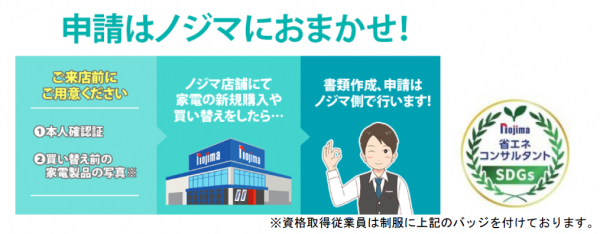 面倒な手続きが大幅に短縮されますので、都民の方はぜひ家電の買い替えや購入をご検討してはいかがでしょうか。スマートフォンをご利用でない場合は申請用紙にて店頭スタッフが申請のお手伝いを行いますのでご安心ください。ノジマでは省エネ関連の知識が豊富なスタッフがおりますので、お困りの際は近くの店頭スタッフまでお声がけください。