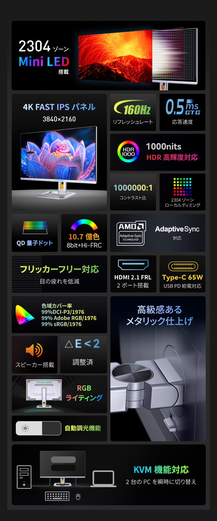 P32A6V-PROはMini LED、量子ドット技術を搭載し2304ゾーンのローカルディミングに対応した32型160Hz対応のハイエンドゲーミングモニターです。4K(3840×2160)の高解像度とsRGB99%±2、DCI-P3 99%±2、AdobeRGB 99%±2の広色域に対応します。最大1000nitsの高輝度によりHDR1000相当の性能を持ち、2304ゾーンのローカルディミングは従来のバックライトに比べ、光漏れを抑制しはっきりとした黒色を再現します。大型の32型FAST IPSパネルは160Hzのリフレッシュレート、0.5ms(GTG)の優れた応答速度に対応し、素早いゲームプレイを実現します。HDMI 2.1ポートを2つ備え、最新の家庭用ゲーム機において4K 120Hz出力でのプレイ、VRR(可変リフレッシュレート機能)にも対応しています。最大で65Wの給電が可能なUSB-Cポートを1つ備え、KVM機能により2台のPCの操作が可能です。