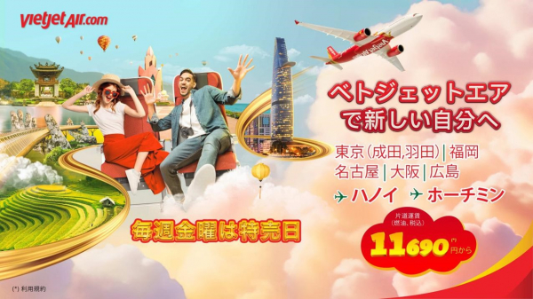 現在ベトジェットでは2024年末までの毎週金曜日に、日本 - ベトナム線およびその他の国際線の運賃が片道わずか11,690円(税・手数料込)からになるチケットプロモーションを実施しています。チケットはベトジェット公式サイト https://www.vietjetair.com 、ベトジェットエアモバイルアプリ、予約オフィス、および世界各地の公式代理店にてご予約いただけます。対象搭乗期間は現在から2025年5月22日(祝日・ピーク時を除く)までです。