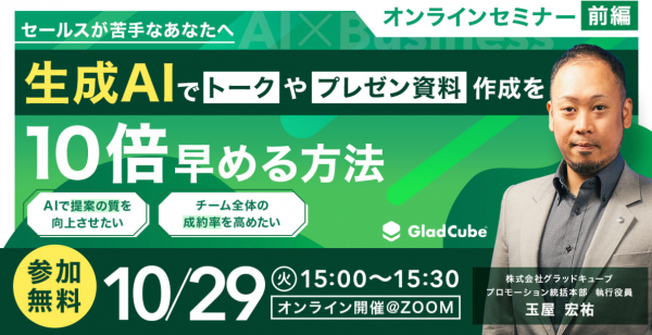 株式会社グラッドキューブ(本社:大阪市中央区 代表取締役 CEO 金島 弘樹 以下:グラッドキューブ)は、2024年10月29日(火)15:00よりオンラインセミナーを開催いたします。