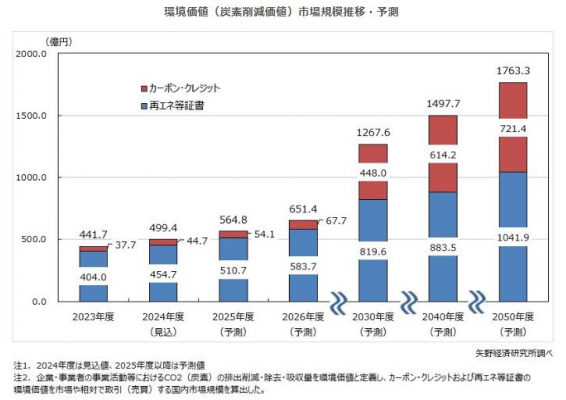 株式会社矢野経済研究所(代表取締役社長:水越孝)では、カーボンニュートラルに向けて、効率的にCO2排出削減を行うためのカーボン・プライシング政策として環境価値(炭素削減価値)市場の国内動向を調査・分析した。ここでは、2050年度までの環境価値市場規模を予測し、公表する。