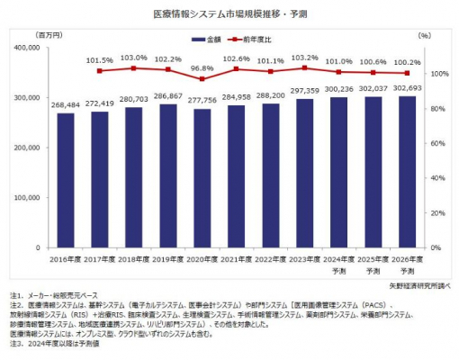医療情報システムは、基幹システムや部門システムの多くでリプレイス中心の市場であることは変わらず、2024年度の医療情報システム市場は前年度比1.0%増の3,002億3,600万円と予測し、その後も同1.0%未満の低い増加率で推移する見通しである。