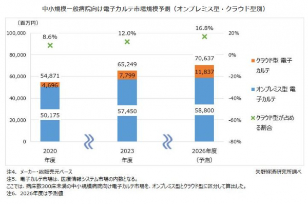 以上のような状況の中、2023年度の中小規模一般病院向け電子カルテ市場規模を652億4,900万円と推計し、2026年度には706億3,700万円になると予測する。そのうちクラウド型が占める割合は2023年度12.0%(77億9,900万円)から2026年度は16.8%(118億3,700万円)に増加すると予測する。