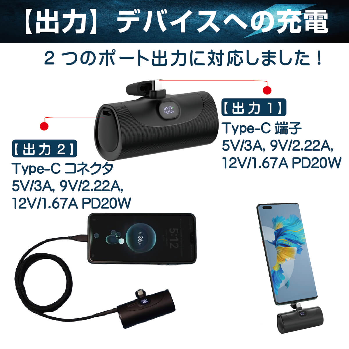 USB Type-Cポート×2(端子、コネクタ)を搭載したモバイルバッテリーです。