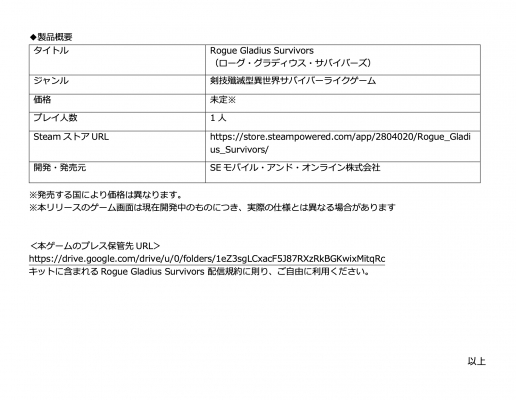 【Rogue Gladius Survivors】は SE モバイル・アンド・オンライン株式会社が開発する<剣技殲滅型異世界サバイ バーライクゲーム>です。従来のサバイバー系ゲームでお馴染みの少しずつ強くなる面白さに加え、異なる能力を持 つ武器を組み合わせる楽しさや狙いすました必殺技でド派手に敵を蹂躙する爽快感が味わえます。今回はタイムアタ ックを楽しむことができる体験版を SteamNext フェス限定で提供いたします。