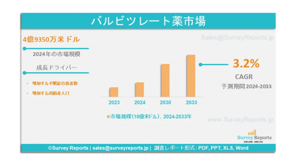 Survey Reports LLCは、2024年10月、バルビツール系薬剤市場のセグメンテーションに関する調査レポートを発行したと発表した。薬剤タイプ別(長時間作用型バルビツール系薬剤、短時間作用型バルビツール系薬剤、超短時間作用型バルビツール系薬剤、配合剤、その他)、 (不眠症、てんかん、鎮静剤、その他)、流通チャネル別(病院、薬局、小売薬局、その他) - 2024年から2033年までの世界市場分析、動向、機会、予測を提供する。バルビツール酸系薬剤市場の予測評価を提供する。バルビツール酸系薬剤市場の成長促進要因、市場機会、課題、脅威など、いくつかの重要な市場力学に焦点を当てている。