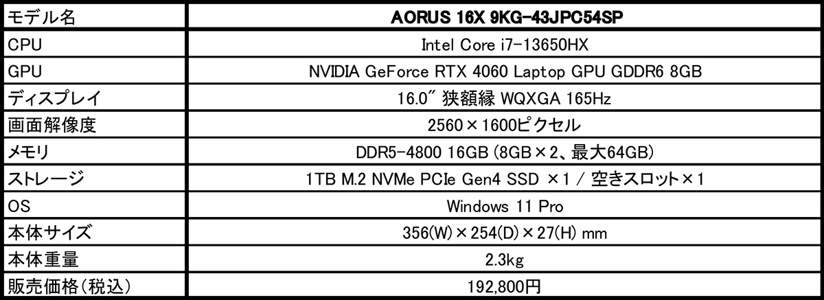 「AORUS 16X 9KG-43JPC54SP」は、CPUに14コア/20スレッドの第13世代Intel Core i7-13650HXプロセッサ(Turbo Boost時最大4.9GHz)、GPUにNVIDIA GeForce RTX 4060 Laptop GPU GDDR6 8GB(最大ブーストクロック2370MHz、最大消費電力140W)をそれぞれ搭載した高性能ゲーミングノートPCです。