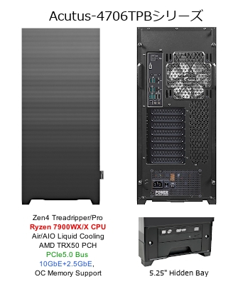 Acutus-4706TPBシリーズは、ソケットsTR5/SP6(LGA-4844)対応のZen4マイクロアーキテクチャー第5世代AMD Ryzen Threadripper Pro 7900WXおよびThreadripper 7900X CPUを搭載したハイエンドデスクトップ/ワークステーションで、5.25インチベイ2台、3.5インチドライブ3台と2.5インチドライブ2台での多彩な組み合わせが可能です。