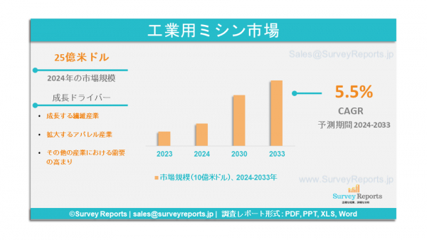 Surveyreportsの専門家は工業用ミシン市場の調査を分析し、2024年に工業用ミシン市場規模が25億米ドルに達すると予測した。さらに、工業用ミシン市場のシェアは、2033年末までに42億米ドルに達すると予測されている。工業用ミシン市場は、2024年から2033年の予測期間にわたって、年間平均成長率(CAGR)約5.5%で成長すると予測されている。