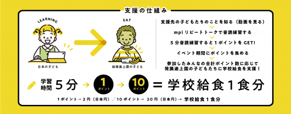 mpi リピートークで取り組んだ「英語を聞く」「音読する」「録音を聞く」時間に応じて、学校給食の支援数が決まります。学習時間5分を1ポイントとし、10ポイントで学校給食1食分が届けられます。今回のイベントでは、3,500食分の学校給食を支援する予定です。