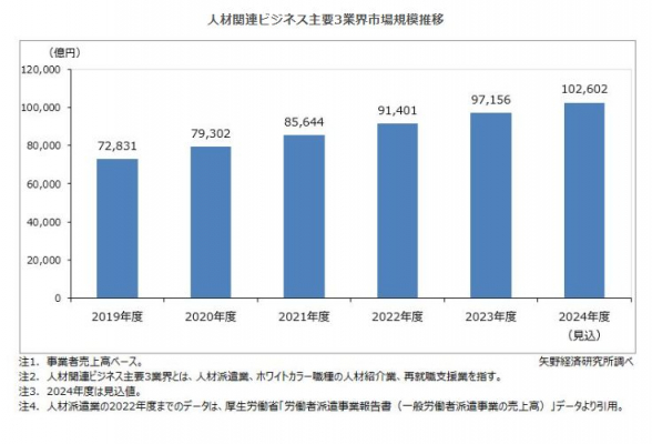 2024年度の人材関連ビジネス主要3業界(人材派遣業、ホワイトカラー職種の人材紹介業、再就職支援業)の市場規模は、事業者売上高ベースで前年度比5.6%増の10兆2,602億円の見込みである。2024年度は継続する人手不足を背景に、引き続きサービス需要が高まっている人材派遣業とホワイトカラー職種の人材紹介業が牽引する形となり、10兆円を上回ると見込む。