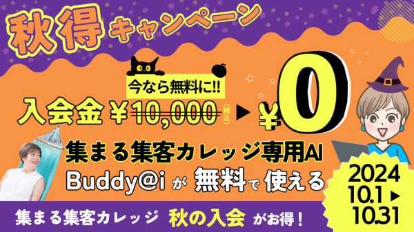 株式会社アクティブノート(東京都調布市、代表取締役社長:長瀬葉弓)が運営する女性起業家の夢と挑戦を応援するAIとWEB集客の総合研究所「集まる集客(R)総研( https://www.active-note.jp/ )」のオンラインサロン集まる集客カレッジが10月のキャンペーンとして「秋のAIチャレンジ秋得キャンペーン入会金0円」を開催します。