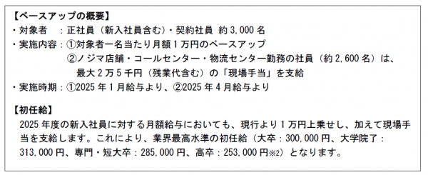 株式会社ノジマ(神奈川県横浜市、代表執行役社長 野島廣司、以下「ノジマ」)は、このたび、初任給を含む基本給の改定および手当の新設を決定しました。全従業員(約3,000名)を対象に2025年1月から月額1万円のベースアップを実施するとともに、現場で働く従業員(約2,600名)を対象に2025年4月から最大2万5千円の「現場手当」を新規に支給する給与改定を行います。