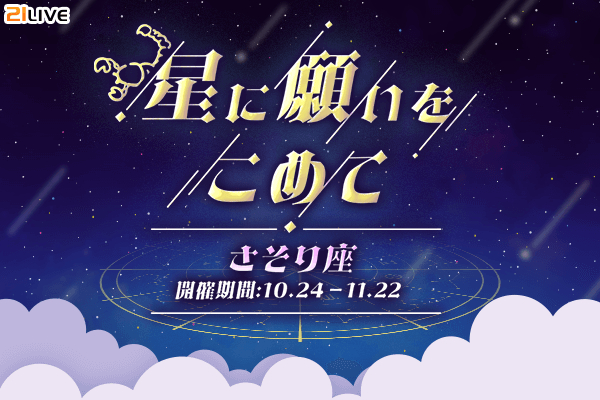 株式会社エムアンドティーティー(本社:沖縄県北谷町、代表取締役:井藤 三知子)が運営するエンターテイメント・ライブ配信アプリ【21LIVE(ニーイチライブ)】URL: https://21.live では、10月24日(木)から11/22(金)にかけて『星に願いをこめて』を開催します。