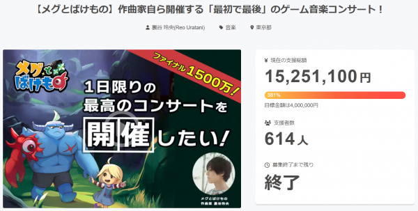 クラウドファンディングが総支援額1,500万円超を達成し終了!コンサートチケットが全席SOLD OUT!