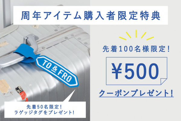 期間中、8周年アニバーサリーアイテムをご購入の先着50名様に、ノベルティとして「ラゲッジタグ」をプレゼントいたします。さらに、8周年アニバーサリーアイテムをご購入の先着100名様には、次回のお買い物で使える500円クーポンをプレゼントいたします。