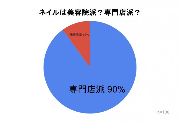 「ネイルは美容院派?専門店派?」のアンケート調査を行ったところ、『専門店派』が90%、『美容院派』が10%となり、ほとんどの人がネイルサロンなどの専門店でネイルをしていることがわかりました。