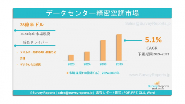 サーベイレポート合同会社は、データセンター精密空調市場の予測評価を提供する調査レポート「データセンター精密空調市場:製品別(CRACユニット、CRAHユニット、その他);展開別(列内冷却、ラック内冷却、集中型、その他)-世界市場分析、動向、機会、予測、2024-2033年」を2024年10月に発行したと発表した。データセンター精密空調市場の成長促進要因、市場機会、課題、脅威など、いくつかの重要な市場ダイナミクスをハイライトしている。