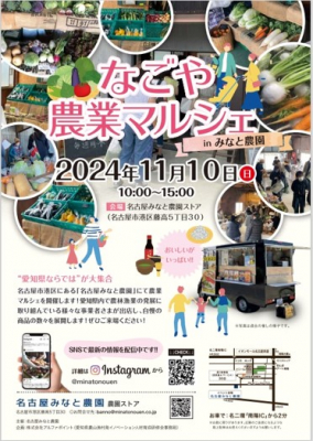 株式会社アルファポイントは、名古屋の人気農家・名古屋みなと農園とともに2024年11月10日(日)10時から15時まで、名古屋みなと農園ストア(名古屋市港区藤高5丁目30)で「なごや農業マルシェ」を開催します。
