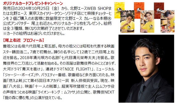 食料品専門店「北野エース」を運営する株式会社エース(東京本部:東京都江東区、関西本部:兵庫県尼崎市、代表取締役社長執行役員:油山哲也)はカレーなる本棚(R)を展開して15周年を迎えました。これを記念して、北野エースカレーなる本棚(R)公式アンバサダー歌舞伎俳優尾上右近監修、株式会社HIRO TOKYOと株式会社エースが共同開発した「麻辣チェッターヒン」を発売します。本商品は、2024年10月25日(金)から北野エースWEB SHOP、全国の北野エース店舗(※一部店舗を除く)にて販売開始します。