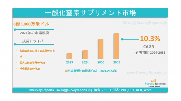Survey Reports LLCは、2024年10月、一酸化窒素サプリメント市場の製品タイプ別(粉末、カプセル、液体、グミ)セグメンテーションに関する調査レポートを発行したと発表した。流通チャネル別(ハイパーマーケット/ スーパーマーケット、コンビニエンスストア、百貨店、オンライン販売チャネル) - グローバル市場分析、動向、機会、予測、2024年から2033年)を発行したと発表した。このレポートは一酸化窒素サプリメント市場の予測評価を提供しており、一酸化窒素サプリメント市場の成長促進要因、市場機会、課題、脅威を含むいくつかの重要な市場力学を強調