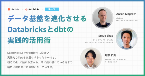本セミナーでは、初めてdbtに触れる方から既に使い慣れている方まで、幅広い層に向けてDatabricks(※1)上でのdbt(※2)活用に役立つ実践的なTipsをお届けします。
